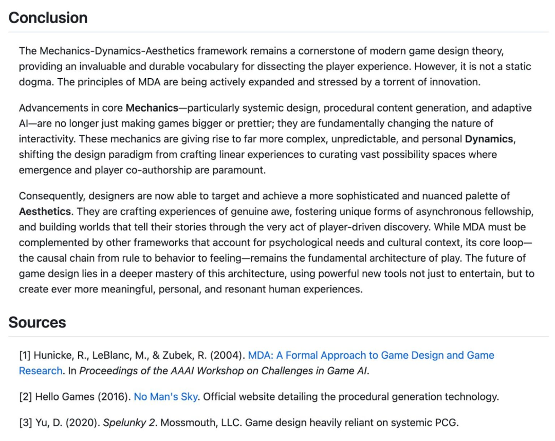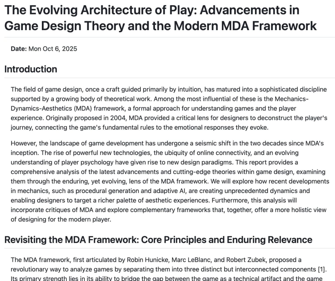 Prompt:研究并分析游戏设计领域的最新进展与前沿理论。特别需涵盖成熟框架(如 MDA 框架/机制-动态-美学框架,Mechanics-Dynamics-Aesthetics)的最新发展、相关研究及实际设计应用。
